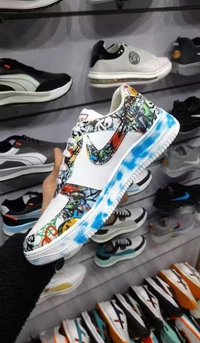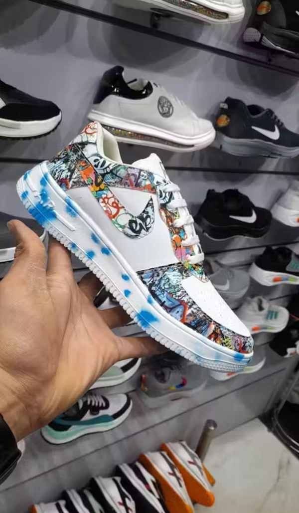 "Step out in bold style with these eye-catching casual sneakers, featuring a dynamic multi-color graffiti-inspired design and distinctive blue splatter pattern. The vibrant printed pattern on a crisp white base offers a trendy urban aesthetic, perfect for adding a unique pop of color to your everyday look.